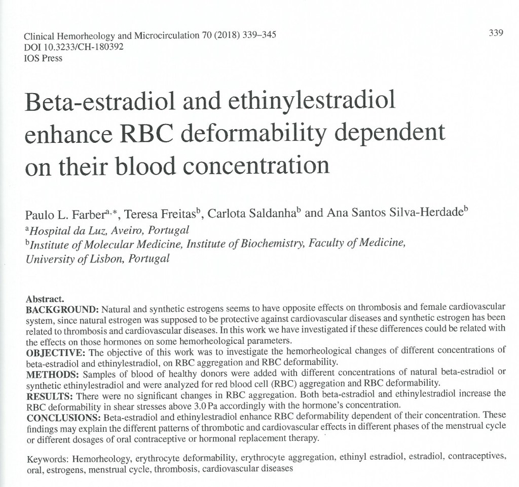In this research published in 2018, we found that both natural and synthetic female hormones (used in contraceptive pills and hormone replacement therapy) modified the deformability (stiffness) of red blood cells, depending on their concentration.