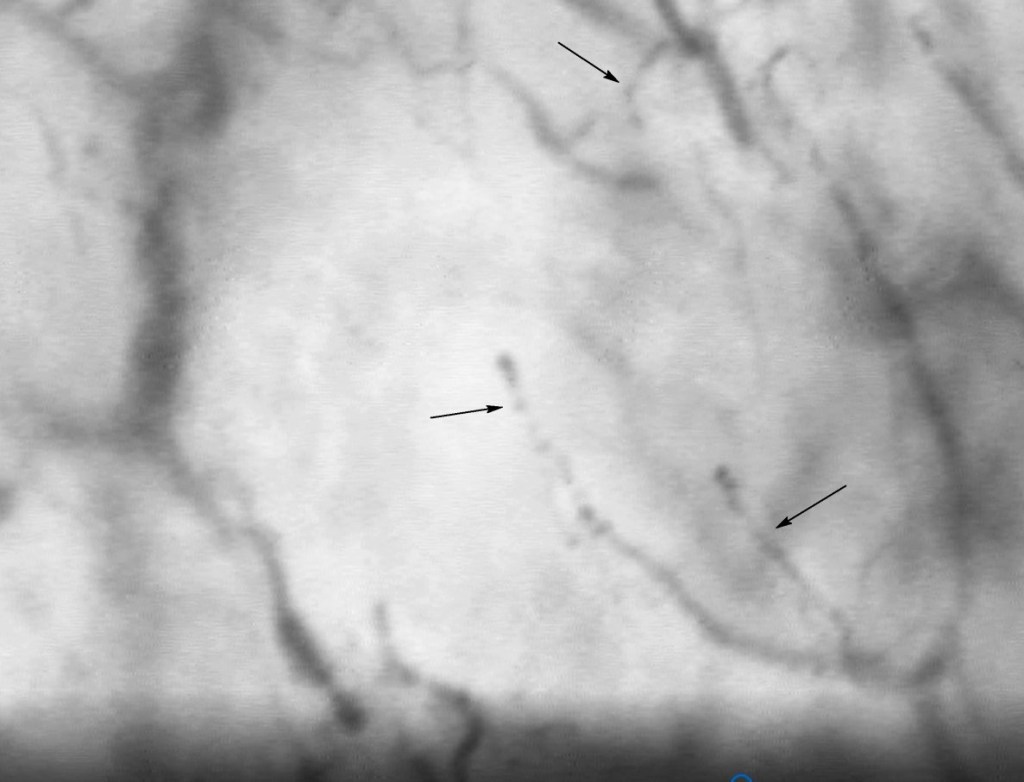 Microscopic image of sublingual blood vessels. The arrows point to erythrocytes (red blood cells) when passing through the microcirculation, where properties such as aggregation (when they are “stuck”) and deformability (when they become more rigid) interfere with blood viscosity.