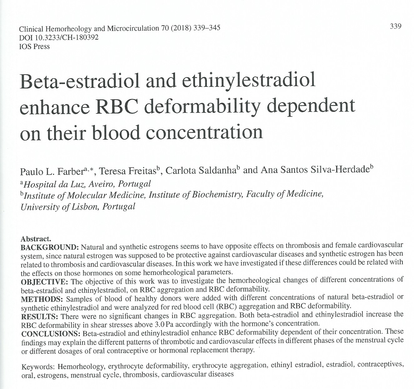 Como ginecologista, iniciei esse estudo com os hormônios (ou hormonas em português de Portugal) femininos. Sabia que o hormônio beta-estradiol protegia as mulheres, pois quando este hormônio declina na menopausa, iniciam-se os problemas de saúde como as doenças cardiovasculares. Também sabia que tanto o uso de pílulas anticoncepcionais como a reposição hormonal também pioravam a saúde, favorecendo doenças como a trombose, o câncer e as doenças cardiovasculares. Como acreditava que a causa da piora após a adição de hormônios artificieis fosse a estrutura bioquímica destes hormônios, comparamos quantidades crescentes de hormônios femininos naturais e artificiais adicionadas a sangue de homens. E descobrimos que o que alterava um dos fatores relacionados à viscosidade do sangue era a quantidade dos hormônios, sejam eles naturais ou artificiais, e não a qualidade dele, conforme este artigo publicado na revista Clinical Hemorheology and Microcircularion em 2018. Após finalizar esta pesquisa, os resultados sugeriram que o segredo da saúde ou da doença na menopausa estava relacionada com a viscosidade do sangue na microcirculação. Portanto estudar a piora ou melhora da saúde está diretamente relacionado à viscoelasticidade do sangue, cujo nome técnico é a Hemorreologia. Vamos falar sobre isso nos próximos posts.